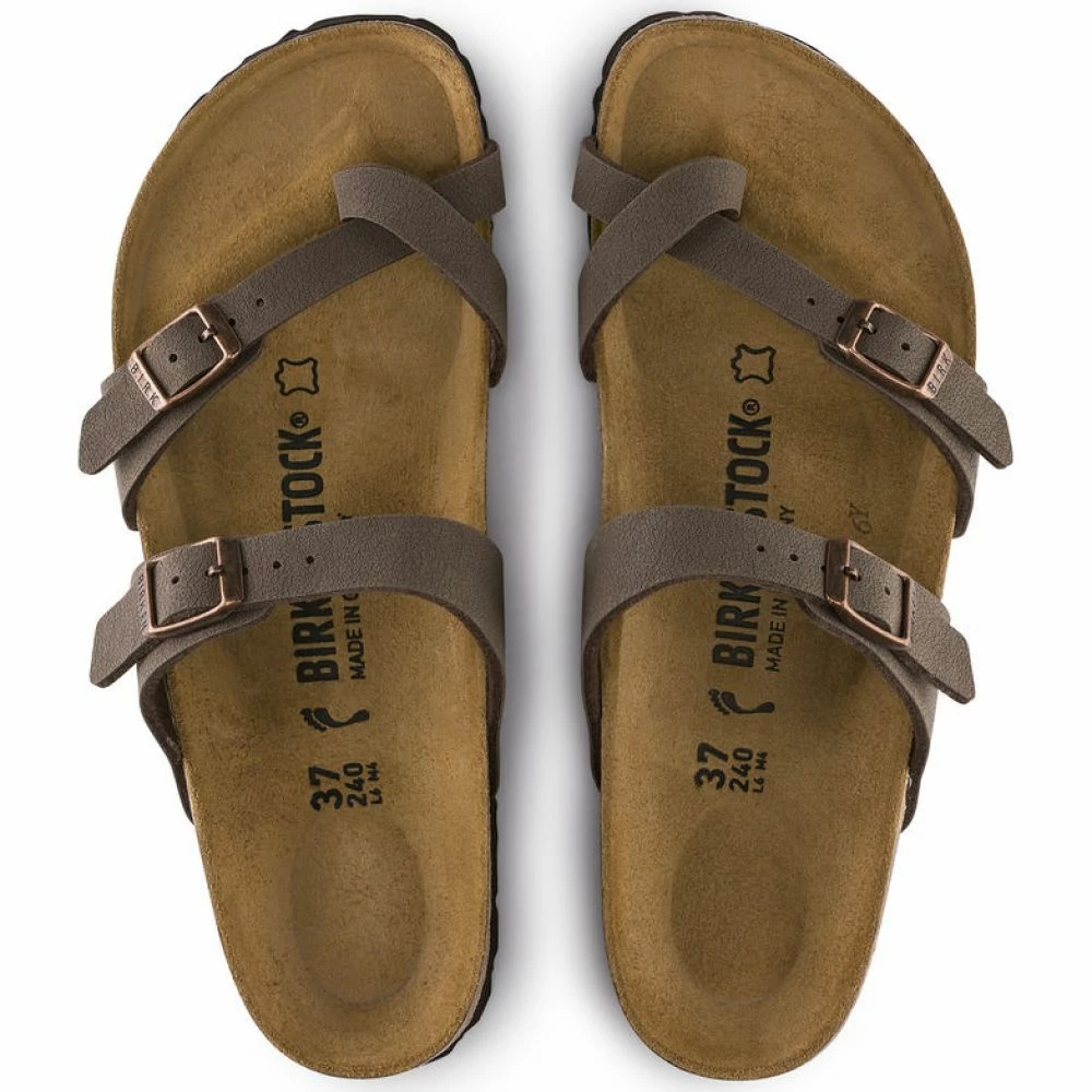 The Birkenstock Mayari thong sandal is a jaunty model with a toe loop. The impressive combination of design and wearability will see fashion-conscious men and women through the day with elegance and comfort. The upper is made from the skin-friendly, hard-wearing synthetic material Birko-Flor® in a sophisticated nubuck look which boasts a texture and color that could almost be mistaken for real leather.