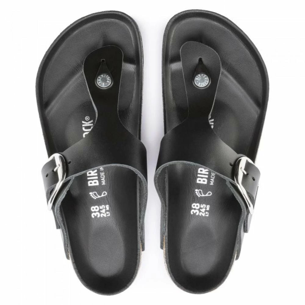 Meet the brand new Birkenstock Women’s Gizeh Big Buckle Leather in Black. This classic thong sandal gets a fresh update with an elegant amplified buckle. Feminine style that’s comfortable and easy to wear. The lining of the semi-exquisite footbed is covered with soft smooth leather and matches the shoe in color. The upper is made from high-quality, soft natural leather.