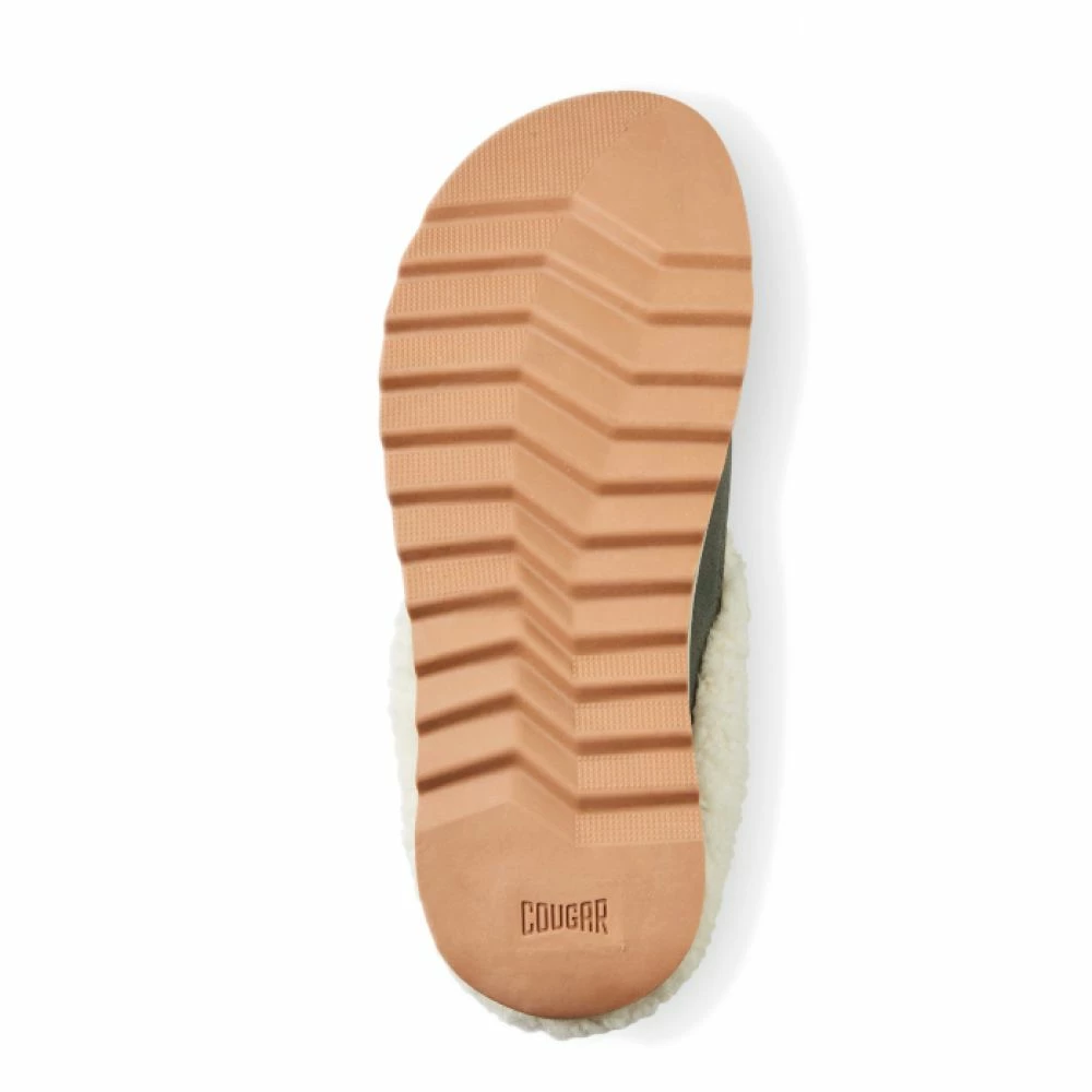 Cougar Liliana Suede Mule is slip-on mule with faux curly Shearling collar and lining. Rounded toe. Flexible Thermoplastic rubber outsole with contrast midsole.